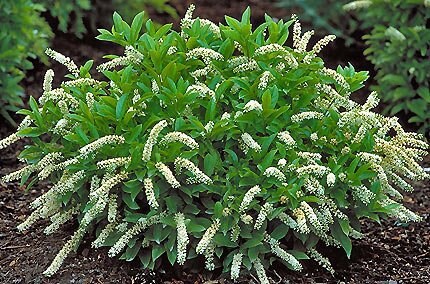 ‘Henry’s Garnet’ Virginia sweetspire is a very dependable, showy plant. It is an arching, 3- to 5-foot-tall shrub that holds its leaves well into fall, allowing the maroon, yellow, and orange tones to develop and reveal themselves over time. Virginia sweetspire also produces an early-summer show, featuring slender, drooping racemes of white flowers that attract all sorts of pollinating insects. Its suckering, slowly spreading, 6-foot-wide habit makes it a good choice for slopes and mass plantings.